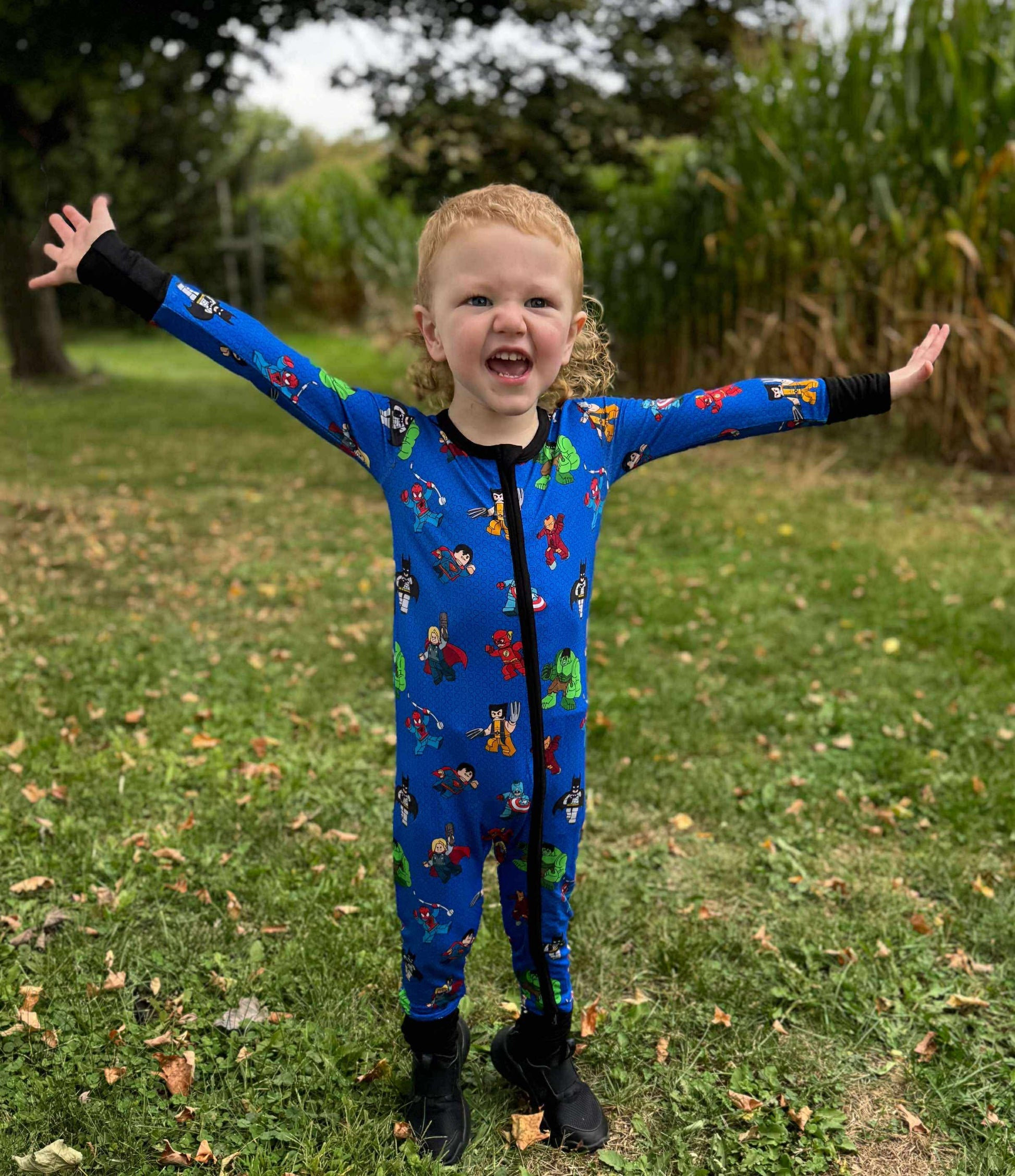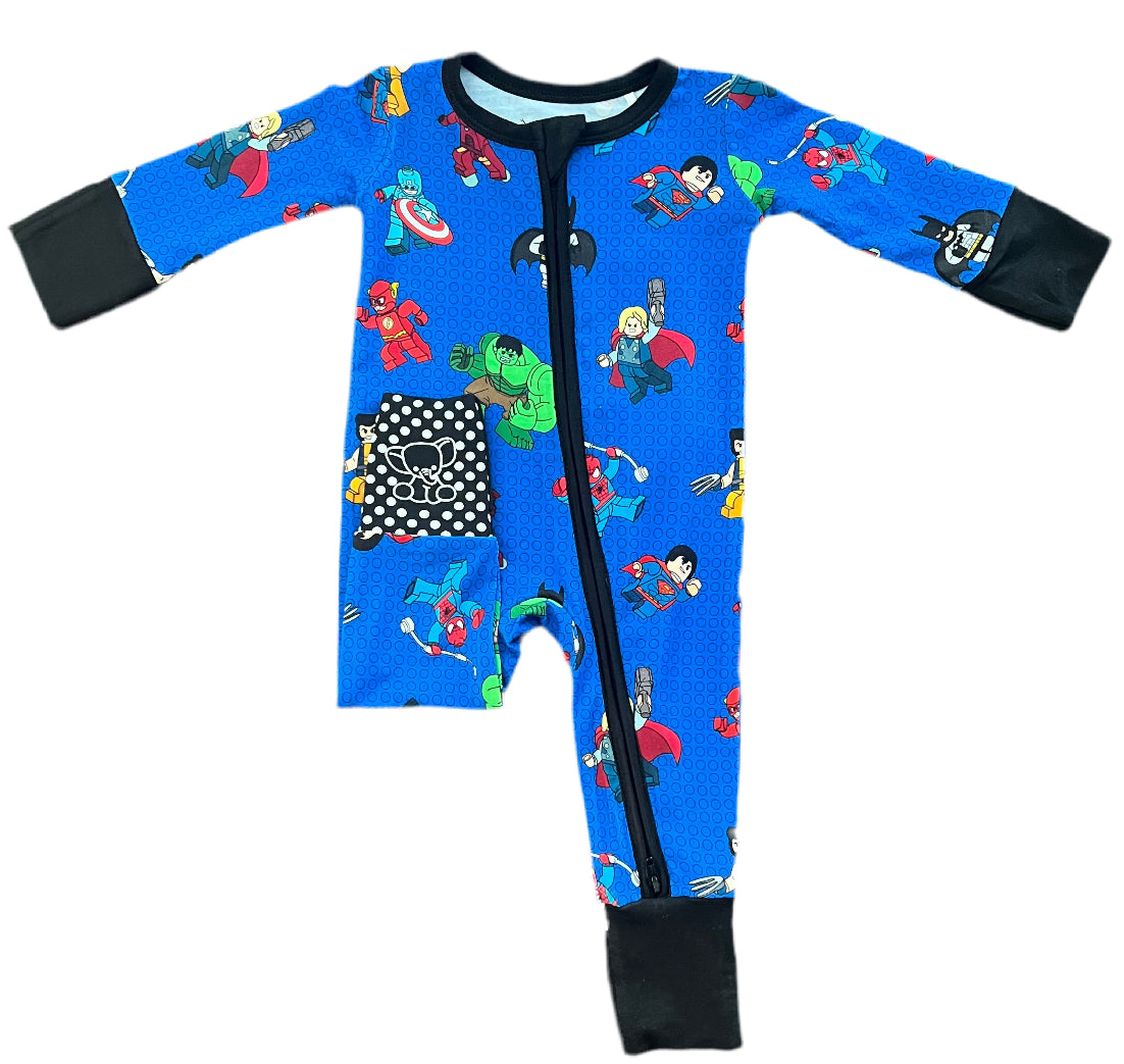 Our Block City Heroes Zippy will leave your little ones comfortable in all seasons. Made with features like fold over feet, mittens, double zipper, and grippys. We have no snaps, buttons, or interior tags. Our bamboo is 200 GSM and makes all sizes room to grow! Make sure you grab this limited edition print in every size before they are gone!
